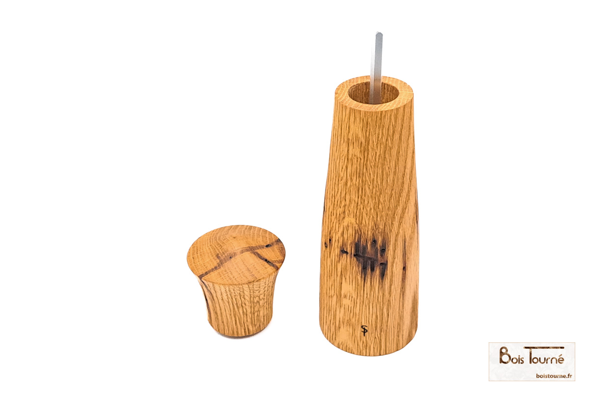 Avant la finition la surface du moulin a été brossé pour donner du relief correspondant aux cernes du bois. Ainsi vous avez le visuel et le touché !