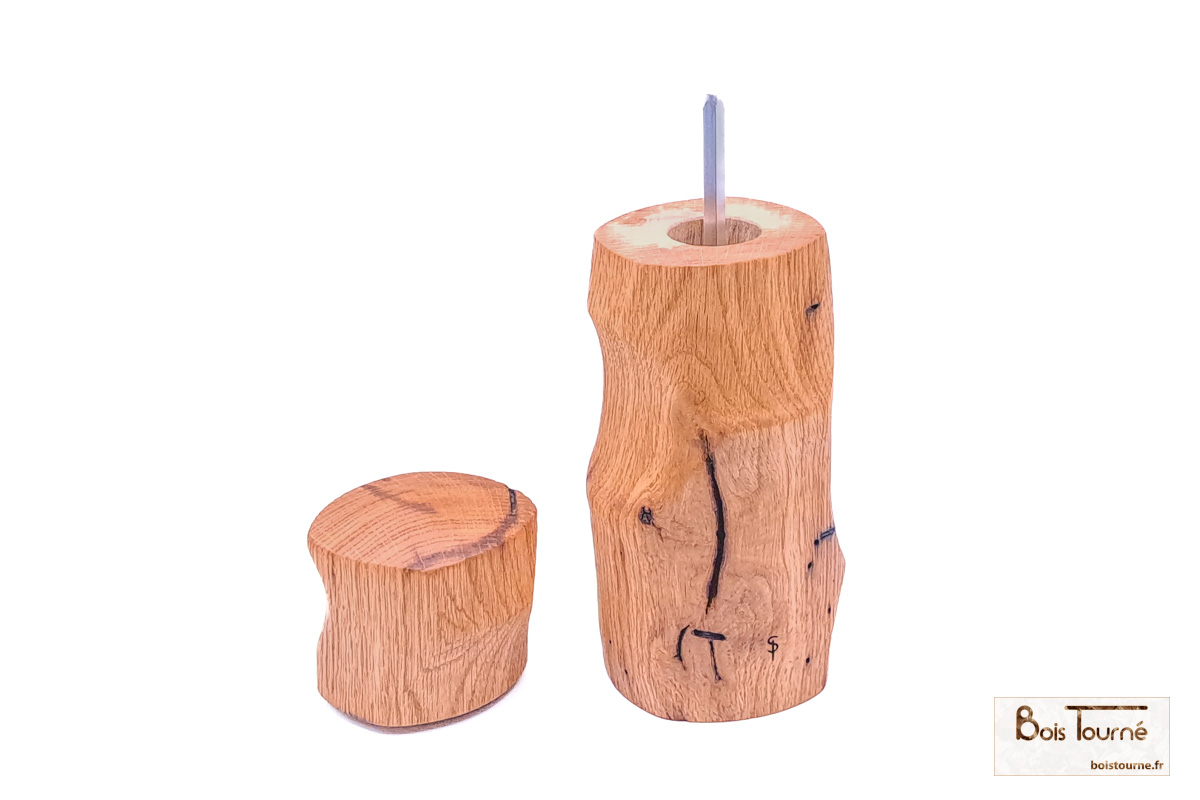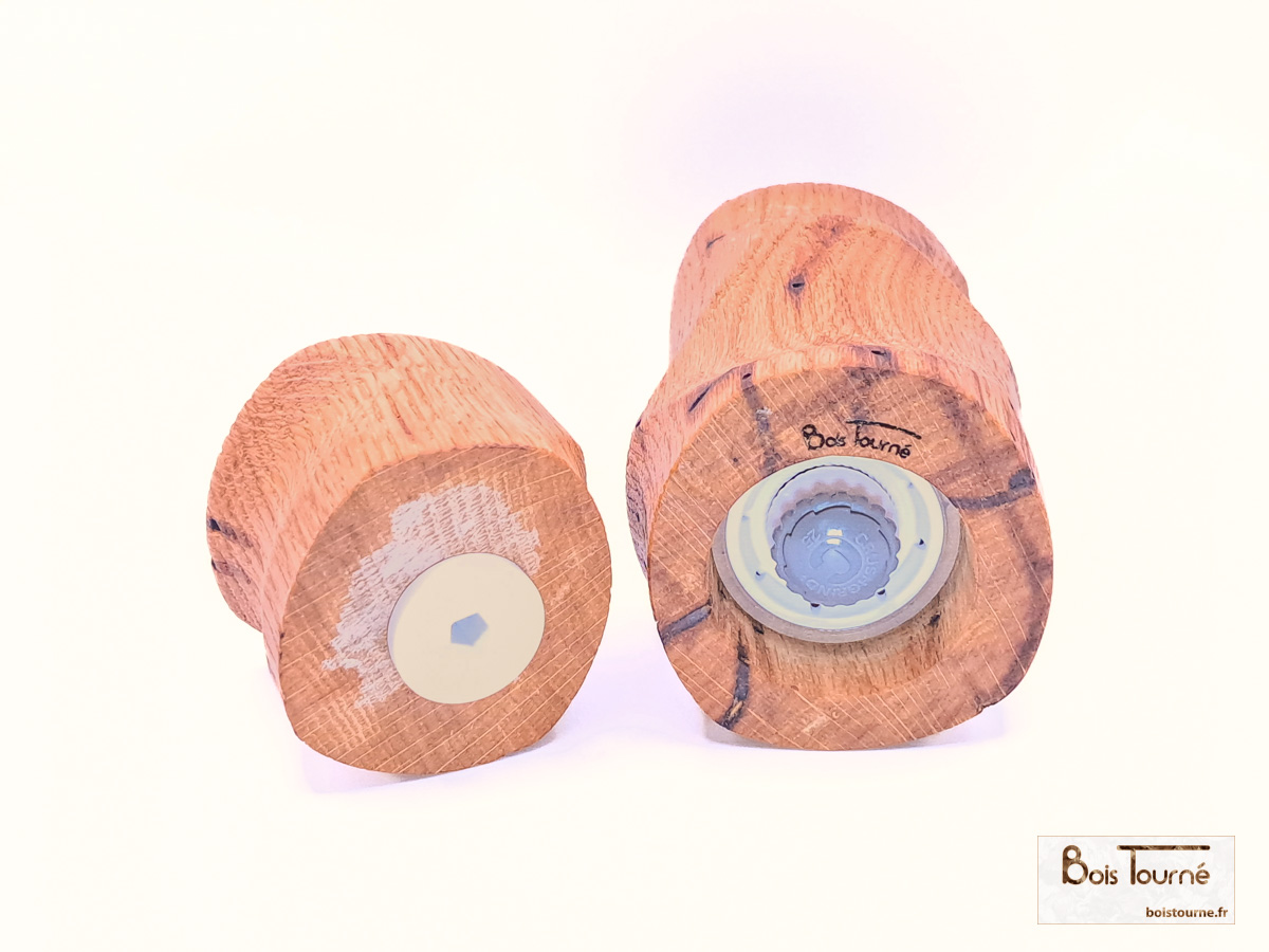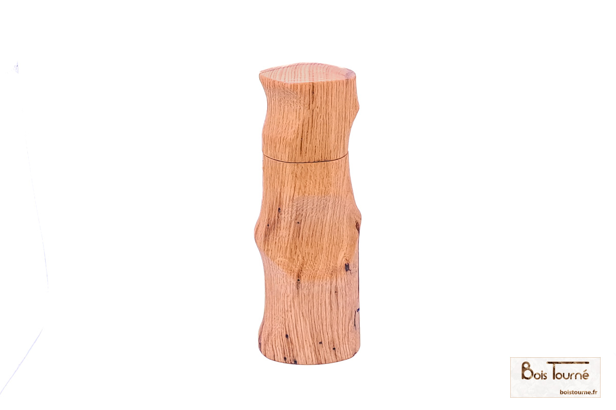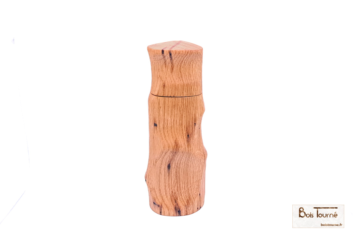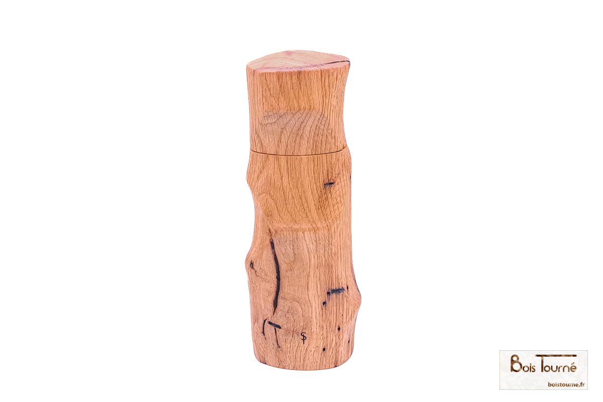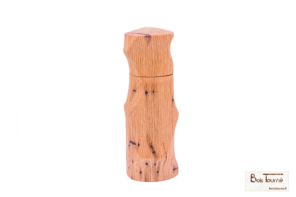 Moulin à sel ou poivre en chêne massif, façonné selon six axes de rotation afin de créer des formes complexes et sculpturales, révélant toute la richesse du travail en tournage multiple. Le chêne, robuste et chaleureux, est sublimé par une finition brossée puis huilée, qui met en valeur le veinage du bois et offre une sensation naturelle et agréable en main. Une pièce unique, à la fois fonctionnelle et expressive, où l’artisanat rencontre l’usage quotidien.