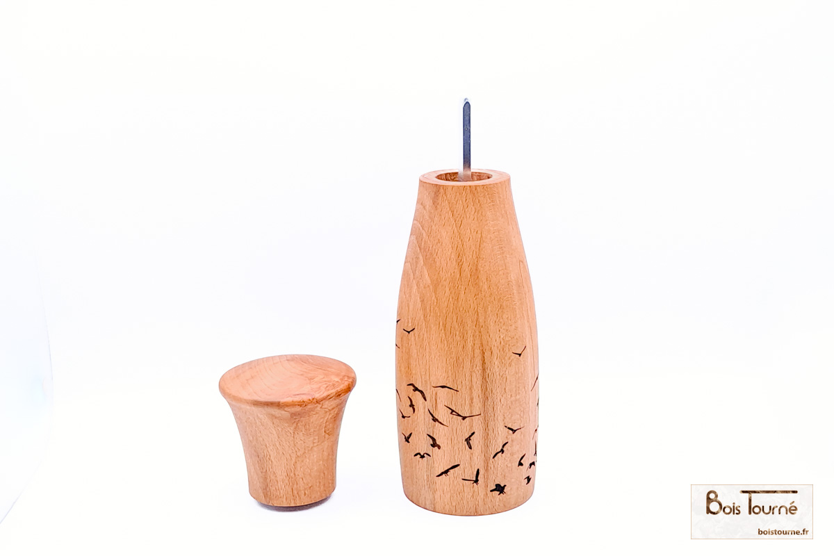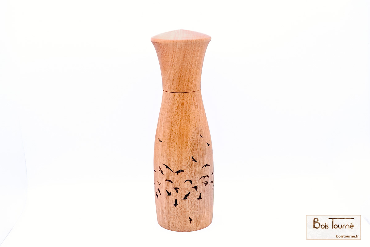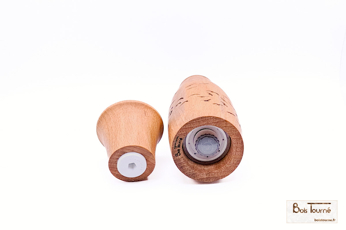 Le mécanisme peut être utilisé pour le sel, le poivre ou d’autres épices. La granulométrie est réglable par une molette située sous le moulin.