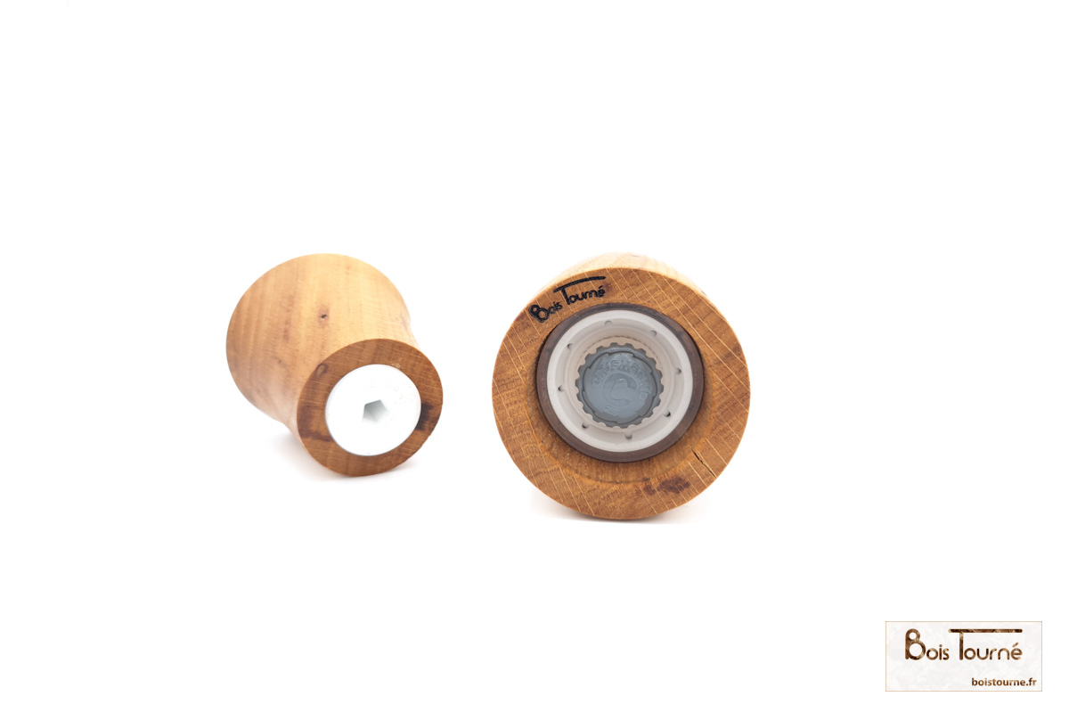 Le mécanisme peut être utilisé pour le sel (même humide), le poivre ou d’autres épices. La granulométrie est réglable par une molette située sous le moulin.