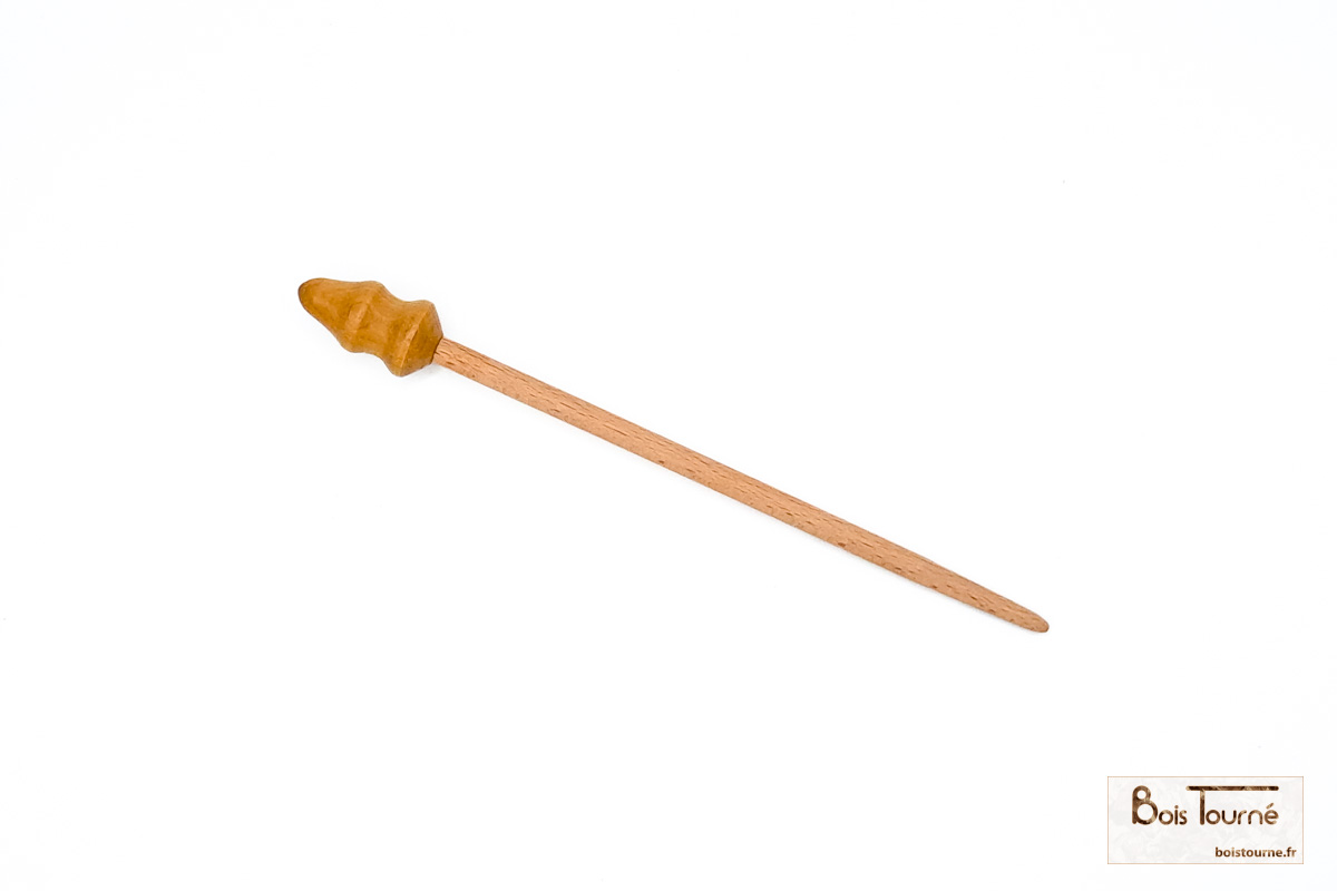 La tige de 6 mm de diamètre est en hêtre, et l’extrémité présente des formes variées, selon le stock de bois disponible.